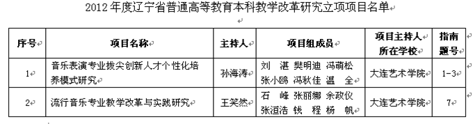 为全面贯彻落实国家和省中长期教育改革和发展规划纲要及教育部全面提高高等教育质量工作会议精神,深化教育教学改革,全面提升本科人才培养质量,根据《辽宁省教育厅办公室关于做好2012年度辽宁省普通高等教育本科教学改革研究项目立项工作的通知》(辽教办发[2012]89号)精神,beat365官网组织开展了2012年度辽宁省普通高等教育本科教学改革研究项目立项申报工作。省教育厅按照立项工作管理办法和程序,经专家委员会评审,确定了beat365官网申报的2项教改项目为2012年度辽宁省普通高等教育本科教学改革研究立项项目。